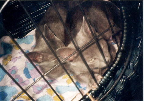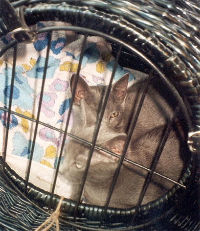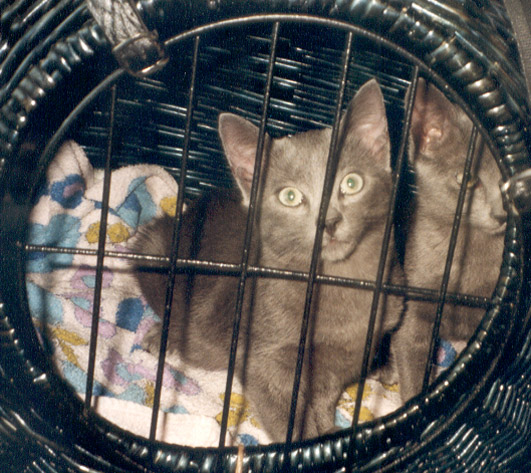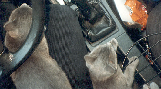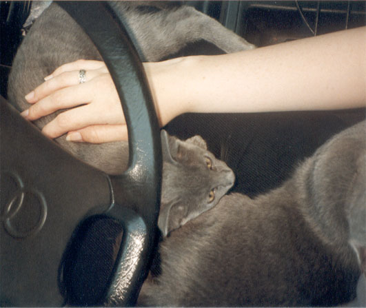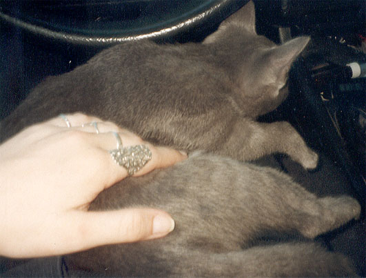 Am 2.8.02 habe ich die beiden Russischblau Katzenkinder Ninotschka und Bakunin ihren neuen Dosis Anne-Marie und Klaus entgegen gebracht. Hier die Fotos von der sehr ruhigen und entspannten Autofahrt