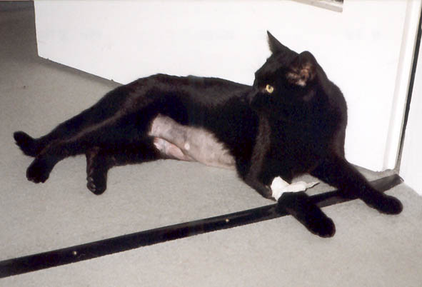 | (Dosimann sagt, getackert hätten wir ihn auch selbst). Und ne Nadel im Arm hatte ich auch. Gaaanz viele Tage musste ich noch da bleiben und die Dosis haben mich nienich abgeholt. Zwar haben die Leute da mich manchmal gestreichelt und waren eigentlich ganz lieb, aber zu Hause ist es schon irgendwie besser! Da war ich dann auch sehr froh, als die Dosis endlich auftauchten und mich mitgenommen haben. So ganz sicher war ich ja nicht, ob die mich nicht vielleicht da lassen! Aber jetzt ist alles wieder in Ordnung und Sammy hat schließlich auch endlich kapiert, dass ich wieder hierher gehöre! Dosifrau hat das übrigens auch alles immer aufgeschrieben. Das könnt ihr hier nachlesen. Und Fotos von meinem Nacktbauch gibts auch". | |