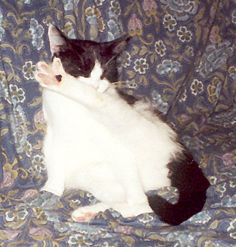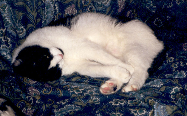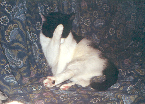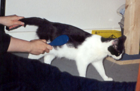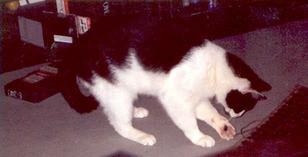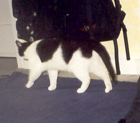 | Freitag, 29.6.: Snoopy ist sehr schlapp, trinkt aber noch und benutzt erstaunlicherweise sicher das Klo. Abends nimmt die Tierärztin Blut ab, um Leukose auszuschließen. Snoopy hat an den geschwollenen Pfoten rumgebissen und hat 39° C. | ||