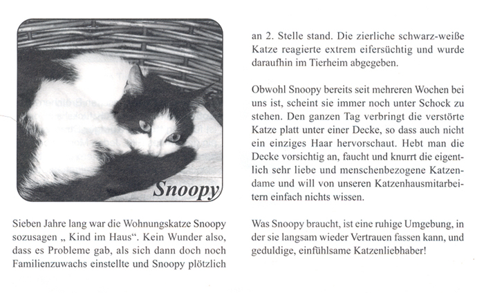 Snoopy war eine ca. 7-8 Jahre alte Katze, die im Tierheim ganz unglücklich war. Ich hatte sie auf der Homepage des Tierheims Bielefeld gefunden und mich sofort irgendwie in sie verguckt. |